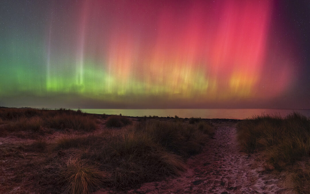 Endnu engang kunne man se røde og grønne søjler danse på himlen, og denne gang kunne man også se dem spejlet i havet (men svagt) – Himlen var der dog intet at være i tvivl om, det er HELT sikkert 😉