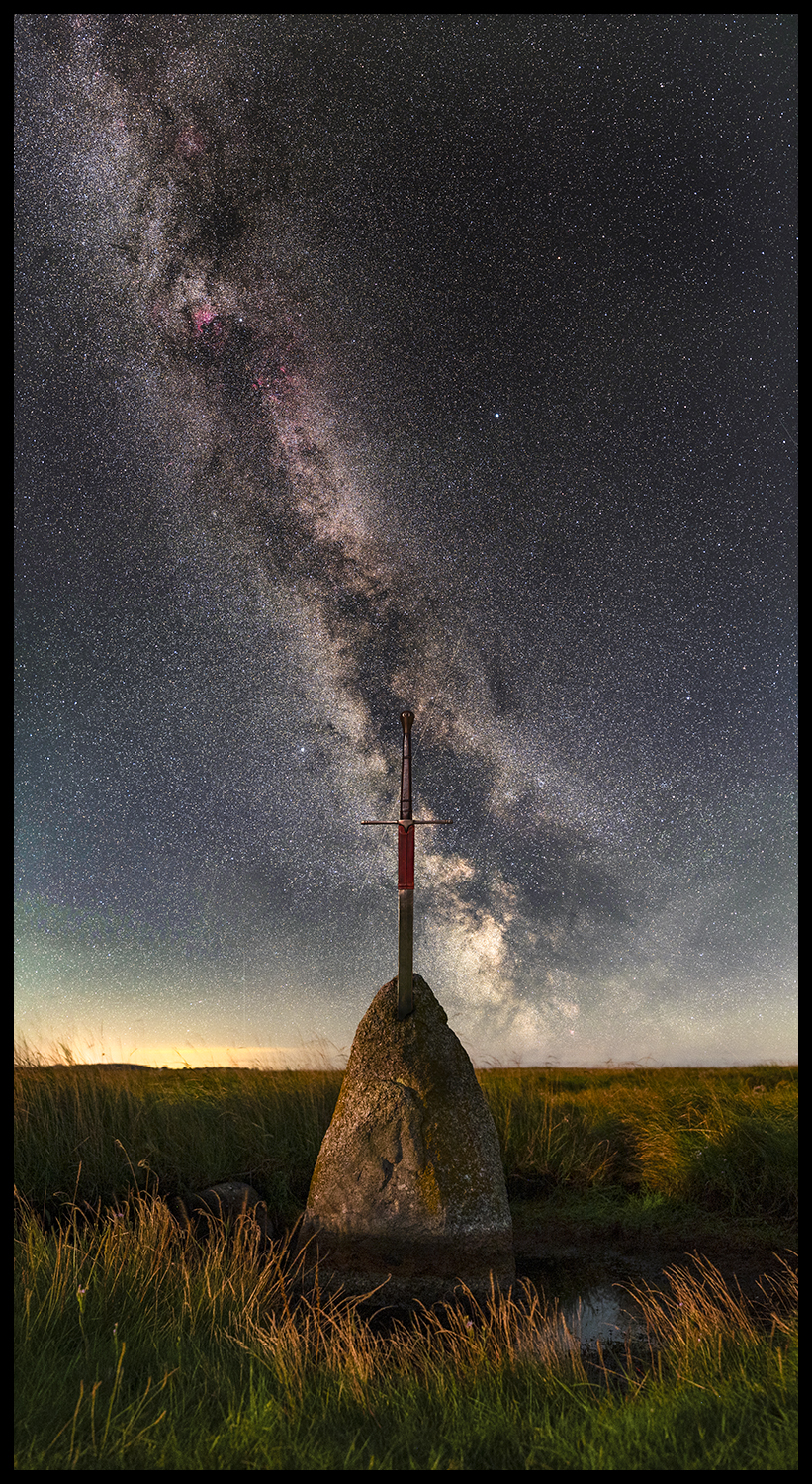 Så, jeg har brugt lidt tid på at finde en fed lokation der kunne bruges til at lave dette billede – Og på Lolland står denne sten, som kaldes for “knækkeryg stenen” – Den står så fedt placeret i et tidevands område, omkranset af græs, og ofte med vand i hullet den står i. En nat i august udnyttede jeg at månen kun lige var begyndt at kikke frem over horisonten, og tog dette billede af stedet – Efterfølgende har jeg taget billedet af sværdet derhjemme i min have i samme vinkel (i relation til månens lys).