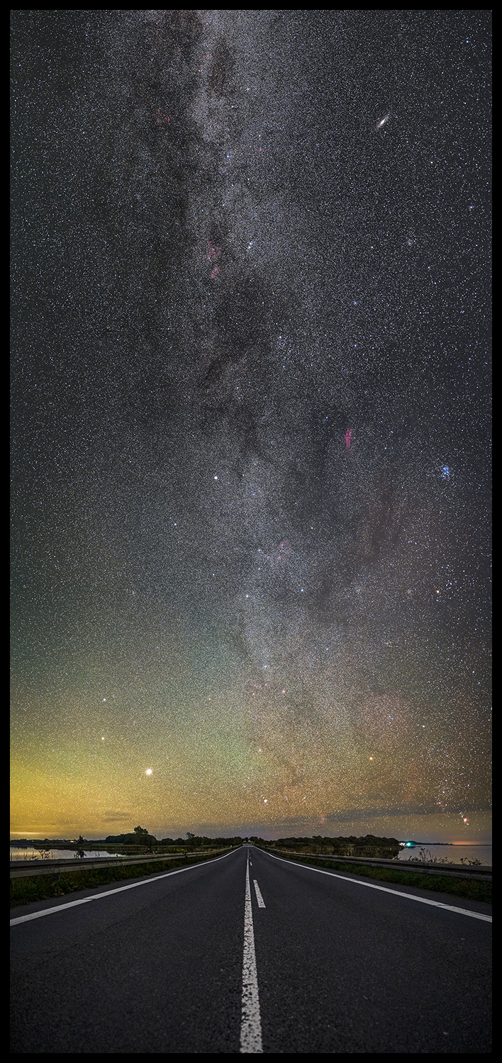 Vejen langs Bogø dæmningen virker endeløs når man ser den fra den rigtige vinkel. På himlen rejser Orion sig langsomt over horisonten, mens Californiatågen, Plejaderne og Andromeda allerede funkler om kap med resten af Mælkevejen.